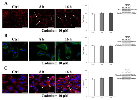 Immunocytochemistry was used to assess the effect of 10 μM Cd treatment on the typical localization pattern of ZO-1, F-actin, and vimentin after 8 and 16 h of administration. Figure 3A shows that in control cells a ZO-1 marginal membrane localized to the cell–cell junctions, with a more prominent and clear immunostaining at the intercellular border (Figure 3A, control), which clearly suggests the presence of the physiological tightness of the barrier. Regarding the cytoskeletal proteins, F-actin exhibited its typical, marginal pattern of localization (Figure 3B, control), whereas vimentin appeared organized in thin fibers forming a network distributed throughout the cell cytoplasm and extending from the nucleus, where it formed a perinuclear ring (Figure 3C, control), to the periphery of the cell. The exposure of RBE4 cells to 10 μM Cd for 8 and 16 h caused time-dependent alterations in all the examined proteins; in particular, the following was evidenced: (1) a loss of ZO-1 staining, leading to a “zipper-like” staining pattern (Figure 3A, cadmium 10 µM, arrows) and holes that became visible between cells (Figure 3A, cadmium 10 µM, asterisks); (2) the formation of numerous F-actin stress fibers (Figure 3B, cadmium 10 µM), and (3) vimentin rupture, and stretching, as suggested by their straight alignment along the major cell axis (Figure 3C, cadmium 10 µM, arrowheads). These alterations were counteracted by the presence of 10 µM α-tocopheryl acetate in the medium (Figure S2), both at 8 and 16 h. Indeed, the ZO-1 alterations (Figure S2, panel A), F-actin stress fiber alterations (Figure S2, panel B), and vimentin aggregates as well (Figure S2, panel C) were superimposable with control, untreated cells. In addition, it is worth noticing that these morphological alterations were not attributable to a decrease in protein expression. Indeed, as reported by western blotting analysis (histograms on the right), ZO-1, F-actin, and vimentin expressions did not decrease after 10 µM Cd treatment both at 8 and 16 h.