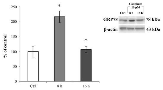 Cd-dependent endoplasmic reticulum (ER) stress. Immunoblot analysis and quantification of GRP78 expression at 8 and 16 h exposure to 10 μM Cd. Control condition was arbitrarily set as 100%, and results are expressed as mean ± S.E.M., n = 9. Significant at * p < 0.05 vs. control (untreated cells) and ^ p < 0.05 vs. 8 h treatment.