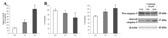 Caspase-3 activity in RBE4 cells after Cd treatment. (A) Caspase 3 activity, revealed by a fluorogenic peptide-based assay, and (B) upregulation of cleaved caspase-3 (17 kDa) and downregulation of pro-caspase-3 (35 kDa) revealed by western blot assay in RBE4 cells, post 10 μM Cd treatment for 8 and 16 h. β-actin was used as an internal control. The control condition was arbitrarily set as 100%, and results are expressed as mean ± S.E.M., n = 9. Significant at * p < 0.05 vs. control (untreated cells) and ^ p < 0.05 vs. 8 h treated cells.