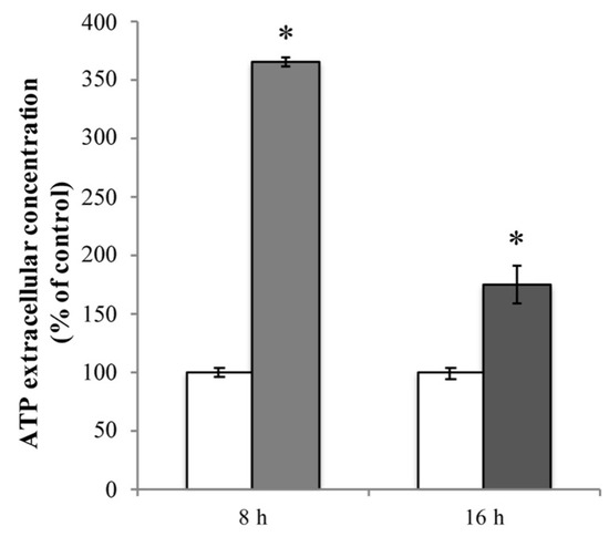 Firstly, we evaluated the extracellular ATP release in RBE4 cells that underwent 10 μM Cd treatment. In cultures exposed for 8 h to Cd, baseline ATP release was significantly elevated (* p < 0.05 vs. control) compared to control cells (Figure 7, light grey bar). This phenomenon was time-dependent since, after 16 h of treatment, the extracellular ATP levels, while remaining significantly higher with respect to untreated cells, exhibited a significant lowering tendency (^ p < 0.05 vs. 8 h treatment; Figure 7, dark grey bar).