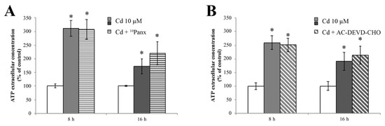 Starting from the demonstration that RBE4 cells express PANX1 [75], and in order to verify if ATP release is dependent on its activation, we treated RBE4 cells with Cd for 8 and 16 h. ATP extrusion was measured in the presence and absence of the selective PANX1 inhibitor 10Panx. Results clearly showed that pretreatment with 10Panx did not result in significantly blunt Cd-dependent ATP release (Figure 8A).