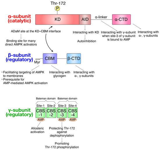 AMPK is a heterotrimeric serine/threonine kinase composed of one catalytic α-subunit and two regulatory β- and γ-subunits, and is highly conserved in all eukaryotes from protozoa to vertebrates (Figure 1) [47,48,49,50,51,52,53,54,55,56].