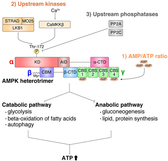 AMPK functions as a central regulator of energy metabolism and, once activated, it turns on catabolic processes as well as turns off anabolic processes, leading to upregulation of adenosine triphosphate (ATP) concentrations (Figure 2). Activation of AMPK is determined by the balance of the following three factors (Figure 2) [48,49,57]: (1) the AMP/ATP ratio [48,57], (2) the activity of upstream kinases to phosphorylate α-subunit Thr-172 including liver kinase B1 (LKB1) and Ca2+/calmodulin-dependent protein kinase kinase β (CaMKKβ) [58,59], and (3) the activity of upstream protein phosphatases that dephosphorylate α-subunit Thr-172 such as protein phosphatase 2A and 2C [49,60].