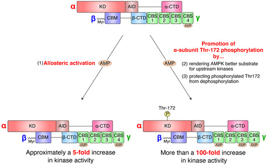 Figure 3. Adenosine monophosphate (AMP) activates AMP-activated protein kinase (AMPK) in several different ways. Allosteric activation results in approximately a fivefold increase in kinase activity, whereas α-subunit Thr-172 phosphorylation causes more than a 100-fold increase in kinase activity; therefore, α-subunit Thr-172 phosphorylation is essentially considered to be a molecular on–off switch for AMPK. KD, kinase domain; AID, auto-inhibitory domain; CTD, C-terminal domain; CBM, carbohydrate-binding module; Myr, myristoylation; CBS, cystathionine beta synthase.