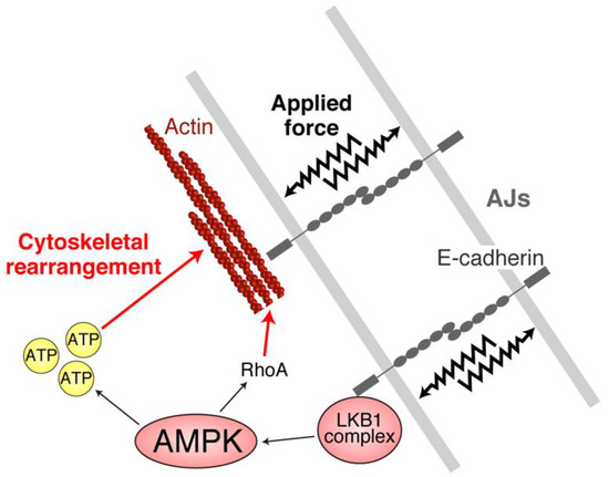 Interestingly, in 2009, it was found that AJs can activate LKB1 complexes [38]. In this study, it was shown that active LKB1 complexes co-localize with E-cadherin in polarized Caco-2 and Madin–Darby canine kidney (MDCK) II cells, that E-cadherin-dependent junctional maturation gradually mobilizes LKB1 complexes to AJs, and that AJ localization of LKB1 complexes is critical for the activation of AMPK. However, the physiological relevance of the LKB1–AMPK axis regulation at AJs remained unknown until 2017 when this regulation was shown to be critical for epithelial cells to resist against applied force. In epithelial cells, mechano-sensing, especially at AJs, triggers robust actin cytoskeletal rearrangements to resist externally applied forces [68,69,70]. From an energetic point of view, these changes are very costly, consuming about half of the total ATP in a cell. In 2017, it was found that junctional tension directly applied on E-cadherin, as well as shear stress on MDCK II cells, facilitates AJ-mediated LKB1–AMPK activation. Activated AMPK subsequently increases ATP levels and activates RhoA to support peri-junctional actomyosin filament rearrangement, thereby contributing to the cell stiffness critical for resisting against applied force [39] (Figure 4). In vivo importance of this AJ-mediated LKB1–AMPK regulation is suggested by the study of the tumor suppressor gene folliculin (FLCN), the causative gene for a rare autosomal-dominant disorder named Birt–Hogg–Dubé (BHD) syndrome. It was shown that FLCN deletion in lung epithelium results in downregulation of E-cadherin and LKB1 expression, which leads to the impairment of AMPK activation and alveolar collapse [71]. Collectively, these findings established the critical role of AJs and junctional tension in promoting the LKB1–AMPK axis to resist applied force.