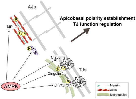 Figure 5. AMP-activated protein kinase (AMPK)-mediated regulation of apicobasal polarity establishment and tight junction (TJ) function are at least partially dependent on its phosphorylation of its substrates in AJCs. AMPK has been shown to phosphorylate myosin regulatory light chain (MRLC), cingulin, G-alpha interacting vesicle associated protein (GIV)/Girdin, claudins, and afadin, which can explain the role of AMPK in apicobasal polarity establishment and tight junction function regulation, at least partially. P, phosphate; AJs, adherens junctions.