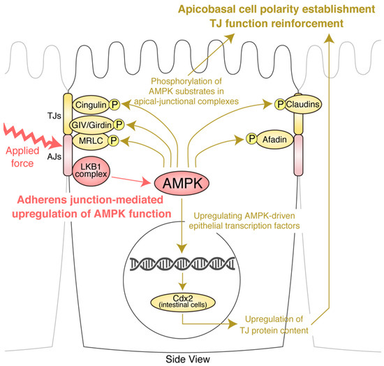 Tight junctions (TJs) are vertebrate-specific junctions that are located most apically in epithelial cell–cell junctions. It is generally accepted that adherens junctions (AJs), which are located immediately at the basal side of TJs, are essential for epithelial cell sheet formation, on the basis of which TJs create a paracellular permselective barrier [6,27,28]. Therefore, TJs and AJs are considered to be spatiotemporally and functionally integrated, and are thus often collectively known as apical junctional complexes (AJCs). In addition to creating a paracellular barrier, AJCs play essential roles in apicobasal cell polarity, mechano-sensing, intracellular signaling cascades, and epithelial morphogenesis [1,6,28,29,30,31,32]. A number of signaling networks are involved in AJC-related events and, over the past 15 years, adenosine monophosphate (AMP)-activated protein kinase (AMPK), a well-known central regulator of energy metabolism signaling pathway, has been shown to have a reciprocal association with AJCs [33,34,35,36,37,38,39,40]. More specifically, AJs activate AMPK particularly in response to applied junctional tension, whereas TJ barrier function and apicobasal cell polarization are promoted by AMPK activation. Herein, we review the critical studies regarding this reciprocal association and discuss the therapeutic potential of AMPK to manipulate epithelial/endothelial barrier function.