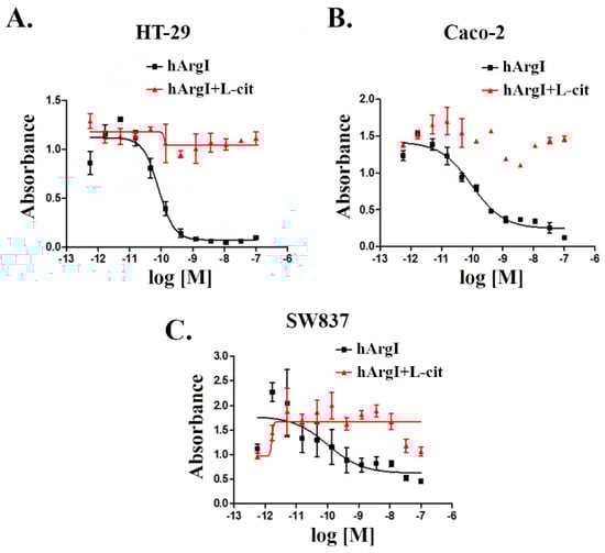 HuArgI(Co)-PEG5000 decreased viability of CRC cells. Non-linear regression curve of the cytotoxicity of the indicated CRC cell lines, HT-29 (A), Caco-2 (B), and SW837 (C) treated with HuArgI(Co)-PEG5000 alone (square) at concentration ranging from 10−12 to 10−7 M or with L-citrulline (11.4 mM) (triangle) at time 72 h. Data are the mean ± SEM. p < 0.05 indicates a statistically significant difference.