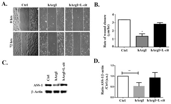 To study the effect of [HuArgI(Co)-PEG5000]-induced arginine deprivation on the migration of CRC cells, wound healing assays were performed. HT-29, Caco-2, and Sw837 cell lines were allowed to grow in low serum medium in monolayers, left untreated or treated with HuArgI(Co)-PEG500 with or without L-citrulline for 72 h. The results showed that [HuArgI(Co)-PEG5000]-induced arginine deprivation led to a significant decrease in the rate of wound closure when compared to that of untreated cells, in Caco-2 cells (p = 0.0257) (Figure 2A,B). The addition of excess L-citrulline completely reversed the effect of HuArgI(Co)-PEG5000] on the rate of wound healing, generating a rate largely similar to that of untreated cells (Figure 2A,B). This indicates that [HuArgI(Co)-PEG5000]-induced arginine deprivation leads to a significant decrease in CRC cell motility. We also tested the effect of HuArgI(Co)-PEG5000 treatment on HT-29 and SW837 cells (Supplemental Figure S2). While both cell lines showed a decrease in wound closure in response to arginase treatment, the inhibitory effect on SW837 motility was less pronounced (Supplemental Figure S2C,D) and that on HT-29 motility was not reversed with L-citrulline addition (Supplemental Figure S2A,B). For these reasons, we continued the study with Caco-2 cells, which showed sensitivity to arginine depletion with regards to their cytotoxicity and migration and which were also responsive to reversal after L-citrulline treatment (partial auxotrophy) making them a very useful model for this study. When Western blots were performed in these cells, they showed a high basal expression of ASS-1 (Figure 2C,D), which is further proof for partial auxotrophic. Interestingly as well, the cells showed a decrease in ASS expression in the [HuArgI(Co)-PEG5000]-treated cells. This was reversed with L-citrulline addition.