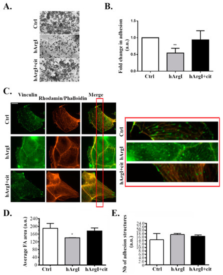 To further study the effect of the drug on the cell migration cycle, cell adhesion was examined by performing a cell adhesion assay. Caco-2 cells were plated on collagen left untreated or treated with HuArgI(Co)-PEG5000 with or without L-citrulline. [HuArgI(Co)-PEG5000]-induced arginine deprivation caused a significant decrease in total cell adhesion of approximately 50% compared to controls (p = 0.0053). Addition of excess L-citrulline reversed the effect of arginine deprivation, restoring cell adhesion to levels similar to those of control cells (Figure 3A,B). Caco-2 cells were then immunostained for vinculin, a component of adhesion structures and focal adhesions were quantitated with a specific macro according to the manufacturer’s instructions using ImageJ [32,33]. Treatment of Caco-2 cells with HuArgI(Co)-PEG5000 with or without L-citrulline had no significant effect on the number of adhesion structures but appeared to lead to a decrease in the area of these structures, which might be consistent with the loss in adhesion capacity of the cells (loss of maturity of focal adhesions) and might be an indication of a decrease in the activity of RhoA (which regulates the maturation of focal adhesions) [15,17] (Figure 3C–E).