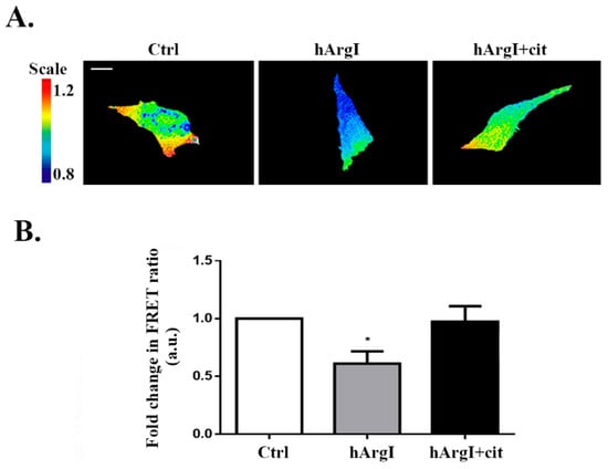 Since RhoA is known to regulate cell adhesion, we then investigated whether the decrease in cell adhesion driven by [HuArgI(Co)-PEG5000]-induced arginine deprivation is mediated though an effect on RhoA activation. The activation levels of RhoA were studied using a previously described unimolecular effector-based RhoA FRET biosensor [13,34]. Caco-2 cells were transfected with the RhoA biosensor and left untreated or treated with HuArgI(Co)-PEG5000 with or without L-citrulline for 72 h. Cells were then imaged for their RhoA activation and the FRET signal was normalized to the total expression of the biosensor. [HuArgI(Co)-PEG5000]-induced arginine deprivation resulted in a significant decrease in RhoA activation levels (approximately 60%), compared to control cells (p = 0.0347). Addition of excess L-citrulline reversed the effects of arginine deprivation, restoring RhoA activation almost to control levels (Figure 4A,B).