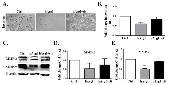 The decrease in cellular invasion was further examined by determining the effect of arginine deprivation on the expression levels of MMP-2 and MMP-9. Caco-2 cells treated with HuArgI(Co)-PEG5000 were plated with or without L-citrulline for 72 h, followed by western immunoblotting. [HuArgI(Co)-PEG5000]-induced arginine deprivation led to a significant decrease only in MMP-9 expression levels (p = 0.0008), compared to control cells. The decrease in MMP-9 levels induced by arginine deprivation was reversed by the addition of L-citrulline, which restored MMP-9 back at control levels. Expression levels of MMP-2 were not affected by arginine deprivation and remained similar to control levels (Figure 5C,D).