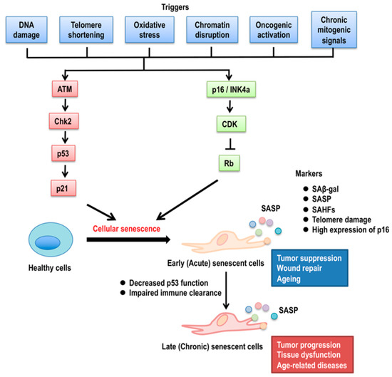 Over five decades ago, Hayflick and Moorhead discovered and described the process of cellular senescence in normal human fibroblasts as a limited number of cell divisions, followed by irreversible growth arrest after serial cultivation in vitro [1,2]. Since then, several types of cellular senescence have been identified. Replicative cellular senescence describes a senescent state with telomere shortening or dysfunctional telomeres [3,4], and stress-induced cellular senescence is induced by cellular stresses, such as mitogenic and oncogenic stimuli, namely p38 MAPK activation and overexpression of oncogenic Ras [5,6]. Senescent cells differ from other non-dividing cells (quiescent or terminally differentiated cells) by several markers, such as the expression of p16INK4A [7,8] and senescence-associated β-galactosidase (SA-β-gal) [7,9], senescence-associated heterochromatic foci (SAHFs) [10], which contribute to silencing E2F target genes such as PCNA and cyclin A, and the senescence-associated secretory phenotype (SASP) [11,12,13], which consists of secreted inflammatory cytokines and other signaling molecules including interleukin-1 (IL-1), IL-6, IL-8, vascular endothelial growth factors (VEGF) [14] and matrix metalloproteinases (MMPs) [15,16]. In general, cellular senescence constitutes a critical mechanism for tumour suppression in vivo and may contribute to organismal aging and age-related diseases. Further, accumulating evidence indicates that the physiological relevance of cellular senescence extends beyond tumor suppression to include several biological processes such as embryonic development [17,18], tissue repair [19,20], and wound healing [20]. Moreover and counterintuitively, recent data strongly suggest that SASP can contribute to not only tumor suppression but also tumor promotion [4,21,22]. The accumulation of senescent cells does not directly determine the organismal lifespan, but it does accelerate with ageing [23,24,25,26]. The increase of senescent cells in aged tissues is thought to cause a functional decline in homeostasis and integrity and is linked with diminished responses to physiological conditions under stress (Figure 1).