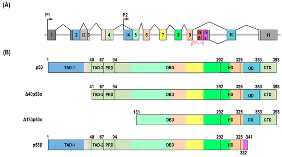 p53 isoforms were first discovered by Matlashewski in 1984 [62]. Wolf et al. showed alternatively spliced C-terminal variants of mouse p53 in 1985, and their results were confirmed in several human cells [63,64,65]. The human full-length p53 protein is composed of 393 amino acids with six classified domains: transcription activation domain (TAD) I (residues 1–40) and TAD II (residues 41–67), which interact with various proteins; a proline-rich domain (residues 68–98), which is conserved in most p53 isoforms; DNA-binding domain (DBD) (residues 94–292); hinge domain (HD) (residues 293–325); oligomerization domain (OD) (residues 326–353); and carboxy-terminal regulatory domain (CTD) (residues 353–393) [66,67,68,69] (Figure 2A). Bourdon et al. recognized that the human TP53 gene structure is similar to human TP63 and TP73 genes and discovered that human TP53 gene encodes at least twelve natural isoforms including the full-length p53 protein due to alternative initiations of translation, usage of alternative promoters, and alternative splicing [70] (Figure 2B). p53 mRNA isoforms are expressed in a tissue-specific manner. For example, while Δ133p53α is expressed in most normal tissues except the prostate, uterus, skeletal muscle, and breast, p53β is expressed in most normal tissues but the brain, lung, prostate, skeletal muscle, spinal cord, and fetal liver.