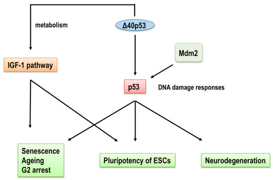 Transgenic mice overexpressing Δ40p53 show small body size and ageing phenotype, including typical lordokyphosis, and reduced bone density. However, these effects are not seen with the same transgenic mice in p53 null background, suggesting that Δ40p53 is dependent on the presence of full-length p53 [79]. Moreover, the phenotype of Δ40p53 transgenic mice alters insulin-like growth factor (IGF) signaling, which is associated with the regulation of ageing [93,94,95,96]. Serum IGF levels were elevated in Δ40p53 transgenic mice more than three-months-old but not in younger mice, and IGF-1 receptor expression levels and activated Akt levels, a downstream target of IGF1, were also upregulated in older Δ40p53 transgenic mice, suggesting that the IGF signaling pathway is altered with an increase in Δ40p53 levels. Additionally, the upregulated IGF signaling pathway in Δ40p53 transgenic mice led to the phosphorylation of p53 at Ser15, resulting in the enhanced the stabilization and transcriptional activity of p53 to induce p21Waf1/Cip1 and Mdm2 through sustained ERK (extracellular signal-regulated kinase) activation [79]. It also led to cell cycle arrest via the activation of ERK signaling, which in turn inhibited cell proliferation. Therefore, the small size of Δ40p53 transgenic mice was caused by decreased cell number, which consequently caused cellular senescence and premature ageing phenotypes [79]. New neurons in the olfactory bulb of the older Δ40p53 mice were reduced compared to wild-type due to the accelerated decline of proliferating cells and stem cells in the subventricular zone by the constitutive activation of full-length p53 and subsequent constitutive expression of p21Waf1/Cip1 in neural stem cells [81]. Mice 2.5-months old and homozygous for a transgene encoding Δ40p53 showed memory and synaptic defects because of IGF-1 receptor hyperactivation and abnormal tau metabolism [97]. The expression of a humanized form of mouse amyloid precursor protein (hAPP) in Δ40p53 transgenic mice also reduced lifespan and degenerated memory-forming and -retrieving areas of the brain compared to hAPP-expressing wild-type mice [97]. Thus, the role of Δ40p53 in ageing is two parts. One has Δ40p53 as a regulator of full-length p53 function by complexing with it, resulting in the capacity to transactivate target genes and to bind Mdm2 to undergo proteasomal degradation. The other has Δ40p53 directly regulating the IGF-1 signaling pathway, mediating cell growth and survival in many tissues (Figure 3).