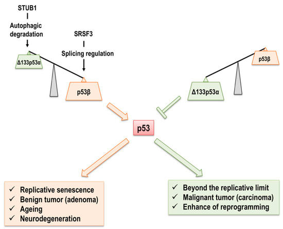 A model for the regulation of cellular senescence, ageing, and age-related disorders by Δ133p53α and p53β. Abundant Δ133p53α competitively acts on p53 functions in proliferating cells, and p53β expression is kept at low levels. In senescent cells, p53β is upregulated by SRSF3-mediated splicing, and Δ133p53α is downregulated by STUB1-mediated chaperon-dependent autophagic degradation. Change in the senescence-associated p53 isoform expression also contributes to tumor progression from adenoma to carcinoma along with neurodegeneration and reprogramming into iPSCs.