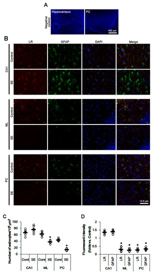 Expressions of 67-kDa LR (LR) and glial fibrillary acidic protein (GFAP, an astroglial maker) in the hippocampus and the PC at 3 days after SE. Reactive astrocytes showed strong 67-kDa LR expression in the CA1 region at 3 days after SE. However, 67-kDa LR expression was reduced in the molecular layer of the dentate gyrus (ML) and the PC due to SE-induced astroglial degenerations. (A) Representative photographs of negative control of 67-kDa LR in the hippocampus and the PC (DAPI counterstaining). (B) Representative photographs of 67-kDa LR and GFAP in the hippocampus and the PC. (C,D) Quantitative values (mean ± S.E.M) of the number of astrocytes (C) and the fluorescent intensities of 67-kDa LR and GFAP (D) at 3 days after SE (n = 7, respectively). Open circles indicate each value. Horizontal bars indicate the mean value. Significant differences are * p < 0.05 vs. control animals (unpaired Student’s t-test).