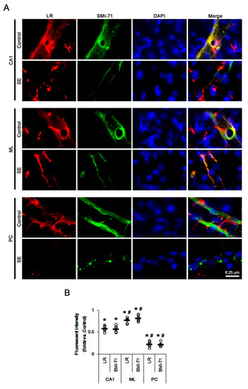 Expressions of 67-kDa LR (LR) and SMI-71 in the hippocampus and the PC at 3 days after SE. SE-induced down-regulations of 67-kDa LR and SMI-71 were detected in the PC more than the CA1 region and the molecular layer of the dentate gyrus (ML). In addition, 67-kDa LR and SMI-71 expressions were preserved in the ML more than the CA1 region. (A) Representative photographs of 67-kDa LR and SMI-71 in the hippocampus and the PC. (B) Quantitative values (mean ± S.E.M) of the fluorescent intensities of 67-kDa LR and SMI-71 at 3 days after SE (n = 7, respectively). Open circles indicate each value. Horizontal bars indicate the mean value. Significant differences are *,# p < 0.05 vs. control animals (unpaired Student’s t-test) and CA1 region (one-way ANOVA followed by Newman–Keuls posthoc test), respectively.