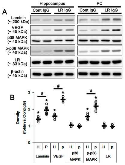 Effects of 67-kDa LR (LR) neutralization on expressions of laminin, VEGF, 67-kDa LR, and SMI-71, and p38 MAPK phosphorylation in the hippocampus and the PC of normal animals. The 67-kDa LR IgG infusion increased expressions of laminin and VEGF, and p38 MAPK phosphorylation in the PC more than the hippocampus without changing 67-kDa LR expression. The 67-kDa LR neutralization also diminished SMI-71 expression in the PC more than the hippocampus. (A) Western blot image for expression levels of laminin, VEGF, 67-kDa LR, and p38 MAPK phosphorylation induced by 67-kDa LR neutralization. (B) Quantitative values (mean ± S.E.M) of the western blot data concerning expression levels of laminin, VEGF, and 67-kDa LR, and p38 MAPK phosphorylation induced by 67-kDa LR neutralization (n = 7, respectively). Open circles indicate each value. Horizontal bars indicate the mean value. Significant differences are *,# p < 0.05 vs. control IgG (unpaired Student’s t-test) and the hippocampus (paired Student’s t-test), respectively.
