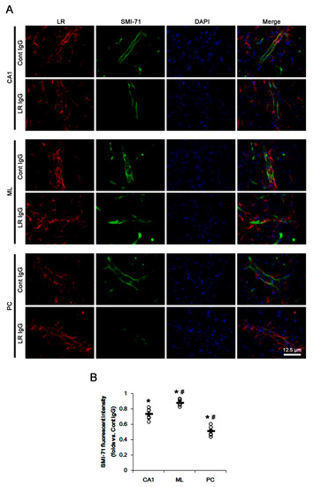 Since SE evoked the massive astroglial loss in the present study, it was impossible to elucidate whether the down-regulation of dystrophin-AQP4 complex expression resulted from the reduced 67-kDa LR expression or astroglial degeneration induced by SE. To overcome these limitations, we applied 67-kDa LR neutralization to control animals. Laminin binding domain on 67-kDa LR is located at amino acid 209–229 regions. However, IgG binding to amino acid 272–280 regions of 67-kDa LR proves to be effective in the prevention of metastasis and angiogenesis while inducing apoptosis in cancers [25]. Since 67-kDa LR antibody used in the present study recognizes the amino acid 250–350 regions on 67-kDa LR, we had believed that 67-kDa LR neutralization would inhibit its downstream signaling cascades, independent of laminin-binding. Consistent with our previous study [15], Figure 4A shows 67-kDa LR IgG infusion increased expressions of laminin and VEGF, and p38 MAPK phosphorylation in the total hippocampus and the PC without changing 67-kDa LR expression level (p < 0.05 vs. control IgG, unpaired Student’s t-test, n = 7, respectively; Figure 4A,B and Supplementary Figure S2). The degree of these alterations was the PC > hippocampus (p < 0.05, paired Student’s t-test, n = 7, respectively; Figure 4A,B and Figure S2). The 67-kDa LR expression was detected in SMI-71-positive endothelial cells. The 67-kDa LR neutralization diminished SMI-71 expression in the parenchymal vessels in the hippocampus and the PC without altering 67-kDa LR expression (p < 0.05 vs. control IgG, unpaired Student’s t-test, n = 7, respectively; Figure 5A,B). These effects of 67-kDa LR neutralization were the PC > CA1 > ML (p < 0.05 vs. CA1, one-way ANOVA followed by Newman–Keuls posthoc test, n = 7, respectively; Figure 5A,B). These findings indicated that endothelial 67-kDa LR inhibition might increase BBB permeability under physiological conditions.