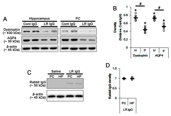 Next, we explored the effect of 67-kDa LR neutralization on dystrophin-AQP4 expressions, since dystrophin-AQP4 complex in astrocytes plays an important role in BBB integrity and serum extravasation [26,27,28]. The 67-kDa LR IgG infusion diminished dystrophin and AQP4 expressions in the total hippocampus and the PC (p < 0.05 vs. control IgG; unpaired Student’s t-test, n = 7, respectively; Figure 6A,B and Figure S3). The effects of 67-kDa LR neutralization on dystrophin-AQP4 expressions were more effective in the PC that those in the total hippocampus (p < 0.05; paired t-test, n = 7, respectively; Figure 6A,B and Figure S3). To confirm whether 67-kDa LR IgG evenly reaches the hippocampus and the PC after intracerebroventricular application, we quantified the amount of 67-kDa LR IgG remaining in the tissue by western blot using anti-rabbit IgG antibody. As a result, we found no difference in the amount of 67-kDa LR IgG between the PC and the total hippocampus (Figure 6C,D and Figure S3). Considering previous studies [3,29,30], these findings indicated the regional specific heterogeneous astroglial properties in the brain, and that the degree of AQP4 down-regulation might also affect the severity of serum extravasation between the PC and the hippocampus.
