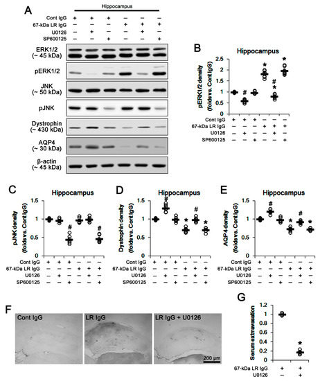 Effects of 67-kDa LR (LR) neutralization on ERK1/2 and JNK activities in the hippocampus of normal animals. U0126 (an ERK1/2 inhibitor), but not SP600125 (a JNK inhibitor), increased expressions of dystrophin and AQP4 in the hippocampus of control IgG-infused animals. The 67-kDa LR IgG infusion elevated pERK1/2, but reduced expressions of dystrophin and AQP4 in the hippocampus, which were attenuated by U0126. SP600125 (a JNK inhibitor) decreased only JNK phosphorylation. U0126 also mitigated vasogenic edema induced by 67-kDa LR neutralization. (A) Western blot image for expression and phosphorylation levels of ERK1/2, JNK, dystrophin, and AQP4. (B–E) Quantitative values (mean ± S.E.M) of the western blot data concerning phosphorylation and expression levels of ERK1/2 (B), JNK (C), dystrophin (D), and AQP4 (E) (n = 7, respectively). Open circles indicate each value. Horizontal bars indicate the mean value. Significant differences are *,# p < 0.05 vs. control IgG and vehicle, respectively (one-way ANOVA followed by Newman–Keuls posthoc test). (F) Representative photographs for serum extravasation in the hippocampus induced by 67-kDa LR neutralization. (G) Quantitative values (mean ± S.E.M) of the serum extravasation in the hippocampus (n = 7, respectively). Open circles indicate each value. Horizontal bars indicate the mean value. Significant differences are * p < 0.05 vs. 67-kDa LR IgG (unpaired Student’s t-test). ERK1/2: extracellular signal-regulated kinase 1/2, JNK: c-Jun N-terminal kinase.