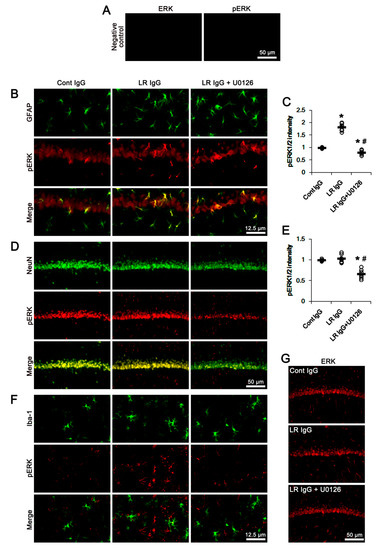 Effects of 67-kDa LR (LR) neutralization on ERK1/2 and pERK1/2 levels in the hippocampus of normal animals. The 67-kDa LR IgG infusion elevated pERK1/2 level in astrocytes, but not CA1 neurons and microglia, without altering ERK1/2 expression. U0126 attenuated pERK1/2, but not EKR, level in these cells following 67-kDa LR IgG infusion. (A) Representative photographs of negative control of ERK1/2 and p-ERK1/2 antibodies. (B) Representative photographs for pERK1/2 level in hippocampal astrocytes. (C) Quantitative values (mean ± S.E.M) of pERK1/2 level in hippocampal astrocytes (n = 7, respectively). Open circles indicate each value. Horizontal bars indicate the mean value. Significant differences are *,# p < 0.05 vs. control IgG and 67-kDa LR IgG, respectively (one-way ANOVA followed by Newman–Keuls posthoc test). (D) Representative photographs for pERK1/2 level in CA1 neurons (NeuN, a neuronal marker). (E) Quantitative values (mean ± S.E.M) of pERK1/2 level in CA1 neurons (n = 7, respectively). Open circles indicate each value. Horizontal bars indicate the mean value. Significant differences are *,# p < 0.05 vs. control IgG and 67-kDa LR IgG, respectively (one-way ANOVA followed by Newman–Keuls posthoc test). (F) Representative photographs for pERK1/2 level in hippocampal microglia (Iba-1, a microglia marker). (G) Representative photographs for ERK1/2 level in the hippocampal CA1 region.