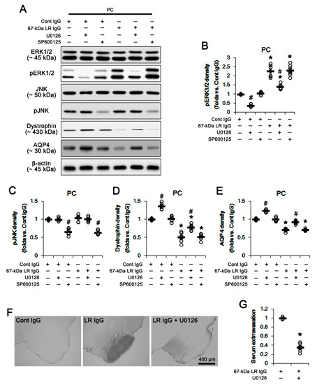 Effects of 67-kDa LR (LR) neutralization on ERK1/2 and JNK activities in the PC of normal animals. U0126 (an ERK1/2 inhibitor), but not SP600125 (a JNK inhibitor), increased expressions of dystrophin and AQP4 in the PC of control IgG-infused animals. The 67-kDa LR IgG infusion elevated pERK1/2, but reduced expressions of dystrophin and AQP4 in the PC, which were attenuated by U0126. SP600125 (a JNK inhibitor) decreased only JNK phosphorylation. U0126 also mitigated vasogenic edema induced by 67-kDa LR neutralization. (A) Western blot image for expression and phosphorylation levels of ERK1/2, JNK, dystrophin, and AQP4. (B–E) Quantitative values (mean ± S.E.M) of the western blot data concerning phosphorylation and expression levels of ERK1/2 (B), JNK (C), dystrophin (D), and AQP4 (E) (n = 7, respectively). Open circles indicate each value. Horizontal bars indicate the mean value. Significant differences are *,# p < 0.05 vs. control IgG and vehicle, respectively (one-way ANOVA followed by Newman–Keuls posthoc test). (F) Representative photographs for serum extravasation in the PC induced by 67-kDa LR neutralization. (G) Quantitative values (mean ± S.E.M) of the serum extravasation in the PC (n = 7, respectively). Open circles indicate each value. Horizontal bars indicate the mean value. Significant differences are * p < 0.05 vs. 67-kDa LR IgG (unpaired Student’s t-test).