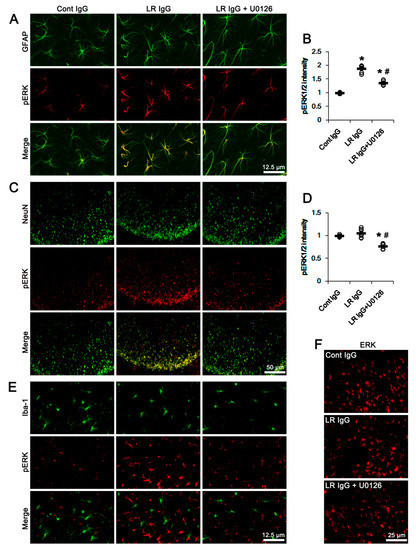 Effects of 67-kDa LR (LR) neutralization on ERK1/2 and pERK1/2 expression in the PC of normal animals. Similar to the hippocampus, 67-kDa LR IgG infusion elevated pERK1/2 level in astrocytes, but not CA1 neurons and microglia, without changing ERK1/2 expression. U0126 attenuated pERK1/2, but not ERK1/2, levels in these cells following 67-kDa LR IgG infusion. (A) Representative photographs for pERK1/2 level in the PC astrocytes. (B) Quantitative values (mean ± S.E.M) of pERK1/2 level in the PC astrocytes (n = 7, respectively). Open circles indicate each value. Horizontal bars indicate the mean value. Significant differences are *,# p < 0.05 vs. control IgG and 67-kDa LR IgG, respectively (one-way ANOVA followed by Newman–Keuls posthoc test). (C) Representative photographs for pERK1/2 level in the PC neurons (NeuN, a neuronal marker). (D) Quantitative values (mean ± S.E.M) of pERK1/2 level in PC neurons (n = 7, respectively). Open circles indicate each value. Horizontal bars indicate the mean value. Significant differences are *,# p < 0.05 vs. control IgG and 67-kDa LR IgG, respectively (one-way ANOVA followed by Newman–Keuls posthoc test). (E) Representative photographs for pERK1/2 level in the PC microglia (Iba-1, a microglia marker). (F) Representative photographs for ERK1/2 level in the PC.