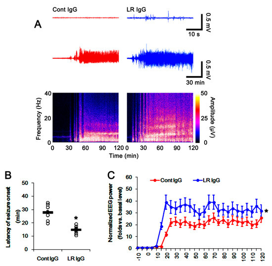 Effects of control IgG and 67-kDa LR IgG on seizure activity in response to pilocarpine. As compared to control IgG infusion, 67-kDa LR neutralization induced paroxysmal discharges on the baseline EEG in the hippocampus 3 days after infusion. In addition, 67-kDa LR IgG reduced seizure latency and increased seizure severity in response to pilocarpine. The 67-kDa LR IgG infusion reduced seizure latency and increased seizure severity in response to pilocarpine. (A) Representative baseline EEG (upper traces), seizure activity (lower traces), and frequency-power spectral temporal maps in response to pilocarpine. (B) Quantification of latency of seizure onset in response to pilocarpine (mean ± S.E.M.; n = 7, respectively). Open circles indicate each value. Horizontal bars indicate the mean value. Significant differences are * p < 0.05 vs. control IgG (unpaired Student’s t-test). (C) Quantification of total EEG power (seizure intensity) in response to pilocarpine (mean ± S.E.M.; n = 7, respectively). Significant differences are * p < 0.05 vs. control IgG (one-way repeated measure ANOVA). EEG: electroencephalogram.