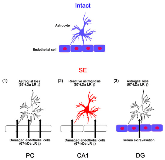 Scheme of the chronological alterations of 67-kDa LR expression in the PC, CA1, and the molecular layer of the dentate gyrus (DG) based on the present data and previous reports [3,4,29,42]. Under physiological conditions, 67-kDa LR is expressed in intact astrocytes and endothelial cells in all regions. (1) Twelve hours to three days after SE, 67-kDa LR expression is reduced in the PC due to astroglial loss and endothelial cell damage. (2) In addition, 67-kDa LR expression is declined only in the endothelial cells within the CA1 region at 1–3 days after SE. Therefore, vasogenic edema in the CA1 region is less severe than that in the PC. (3) Subsequently, 67-kDa LR expression is decreased in the DG at 3–7 days after SE because of massive astroglial loss. The maintenance of endothelial integrity minimizes serum extravasation. Thus, the cellular specific alteration in 67-kDa LR may be involved in the regional specific severity of vasogenic edema induced by SE.