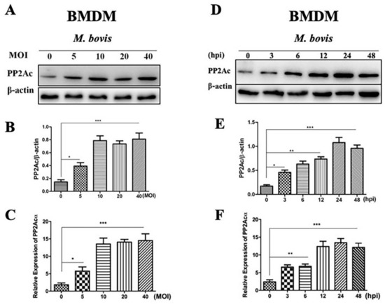 PP2Ac expression in BMDM cells infected with M. bovis. (A–C) BMDM cells were infected with M. bovis (multiplicity of infection (MOI) 5, 10, 20 and 40) for 24 h. (A,B) Cell lysates were used for PP2Ac protein expression by Western blot (WB) assay. (C) Total RNA was extracted and the expression of PP2Acα at mRNA level was determined by quantitative real-time polymerase chain reaction (qRT-PCR). (D,F) BMDM cells were infected with M. bovis (MOI 1:10) for indicated time periods. (D,E) Cell lysates were used for the expression of PP2Ac protein level by WB. β-actin was used as loading control. (F) mRNA level of PP2Acα was determined by qRT-PCR. Data represent the mean ± standard deviation (SD) from three independent experiments. (hpi stands for hours post infection) (* p < 0.05, ** p < 0.01, *** p < 0.001).