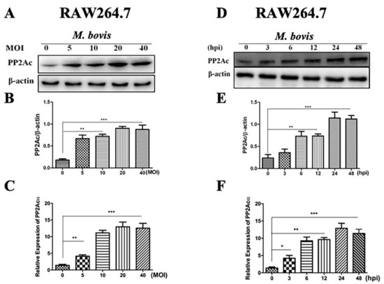 PP2Ac expression in RAW264.7 cells infected with M. bovis. (A–C) RAW264.7 cells were infected with M. bovis (MOI 5, 10, 20 and 40) for 24 h. (A,B) Cell lysates were used for PP2Ac protein expression by WB assay. (C) Total RNA was extracted and the expression PP2Acα at mRNA level was determined by qRT-PCR. (D,F) RAW264.7 cells were infected with M. bovis (MOI 1:10) for indicated time period. (D,E) Cell lysates were used for the expression of PP2Ac protein by WB. β-actin was used as loading control. (F) The mRNA level of PP2Acα was determined by qRT-PCR. Data represent the mean ± SD from three independent experiments. (MOI stands for multiplicity of infection, hpi stands for hours post infection) (* p < 0.05, ** p < 0.01, *** p < 0.001).