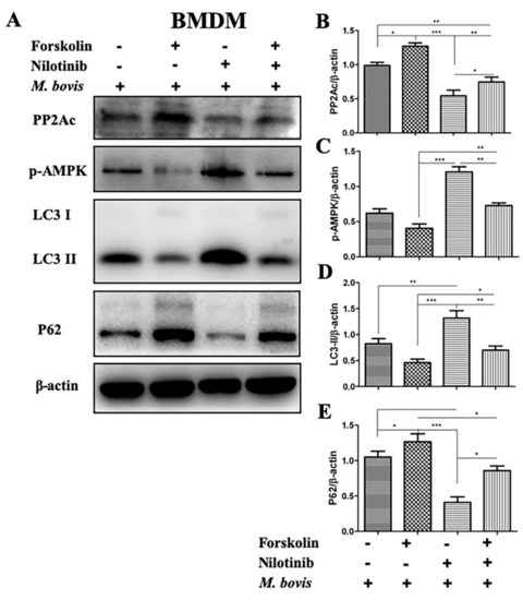 Previously it has been investigated that the catalytic subunit of PP2A (PP2Ac), plays an important role in the regulation of AMPK signaling in human osteoblastic cells [11]. We hypothesized if this could be the case in M. bovis infected macrophages. So, we investigated the role of PP2Ac in the regulation of AMPK-mediated autophagy during M. bovis infection. We treated BMDM cells with PP2Ac antagonist (okadaic acid) and agonist (forskolin) in the absence or presence of TKI-nilotinib before infection with M. bovis. As shown in Figure 4, okadaic acid treatment significantly inhibited the expression of PP2Ac followed by M. bovis infection. Similarly, TKI-nilotinib also reduced the expression of PP2Ac in BMDM cells challenged with M. bovis infection. In addition, further reduction in the expression of PP2Ac was observed in macrophages treated with both okadaic acid and TKI-nilotinib (Figure 4A,B). We also investigated the effect of PP2Ac antagonist and agonist in the absence or presence of TKI-nilotinib on the expression level of p-AMPK in M. bovis infected macrophages. We found that okadaic acid enhanced the effect of TKI-nilotinib on the phosphorylation of AMPK via the inhibition of PP2Ac (Figure 4A,C). Furthermore, an increased level of LC3-II was observed in cells treated with okadaic acid and TKI-nilotinib as compared to untreated controlled cells. The combinatory treatment of okadaic acid and TKI-nilotinib significantly increased the level of LC3-II as compared to the treatment given alone (Figure 4A,D). On the other hand, p62 was inhibited by okadaic acid and TKI-nilotinib alone or combinatory treatment (Figure 4A,E). Next, we used PP2Ac agonist forskolin in the absence or presence of TKI-nilotinib to further evaluate the role of PP2Ac in the regulation of autophagy. As shown in Figure 5A, we found an increased expression of PP2Ac upon forskolin treatment (Figure 5B,F). In addition, forskolin treatment significantly reduced the phosphorylation of AMPK induced by TKI-nilotinib in M. bovis-infected macrophages (Figure 5A,C). Similarly, a significant reduction was observed in the level of LC3-II in M. bovis-infected BMDM cells (Figure 5A,D) upon forskolin treatment. The TKI-nilotinib inhibited the effect of PP2Ac agonist on the lipidation of LC3-II (Figure 5A,D). In contrast, forskolin a PP2Ac agonist enhanced the expression of p62 which is an important substrate of autophagy regulation. The TKI-nilotinib also significantly reduced the effect of forskolin on the expression of p62 in M. bovis-infected macrophages (Figure 5A,E). In PP2Ac agonist and antagonist optimization experiments, we found that okadaic acid (10 nM) and forskolin (10 µM) showed no significant effect on the viability or bacterial uptake of macrophages (Supplementary Figure S1A–C). Collectively, these results demonstrated that PP2Ac is crucial target for the regulation of autophagy mediated by AMPK during M. bovis infection.