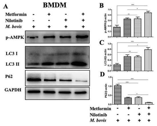 AMPK agonist contributes the regulation of autophagy by TKI (nilotinib) in M. bovis-infected macrophages. (A) BMDM cells were treated with metformin (10 µM), TKI-nilotinib (10 µM), alone or metformin + TKI-nilotinib followed by infection with M. bovis (MOI 1:10) for 24 h (DMSO 0.1% used as solvent control). The expression levels of (B) p-AMPK, (C) LC3-II and (D) P62 were determined by using WB and normalized against GAPDH. Data represent the mean ± SD from three independent experiments. (“−“refers the untreated group and “+” refers the treated group for the mentioned treatments) (* p < 0.05, ** p < 0.01, *** p < 0.001).