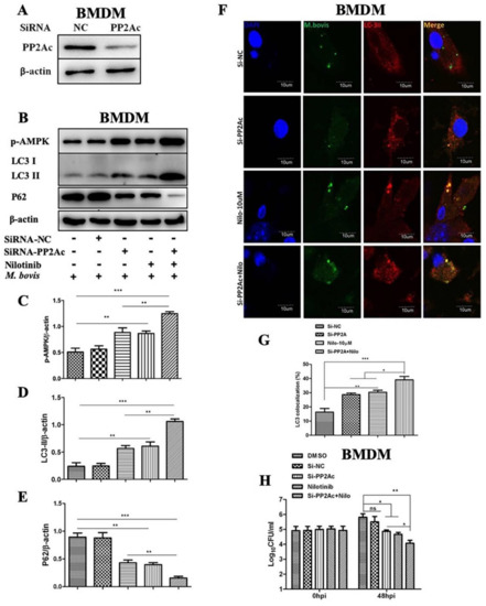 Although the role of PP2Ac in cellular response to inflammatory stimuli that modulates cytokines expression had been increasingly investigated previously [25,26], however, the role of PP2Ac in the regulation of autophagy as mediator of innate immune response against intracellular pathogens remains unknown. Previous study reported that tyrosine kinase inhibitor nilotinib modulated the expression of PP2Ac [21]. In the current study, we hypothesized whether tyrosine kinase inhibitor (TKI) nilotinib will influence the expression of PP2Ac during M. bovis infection. Therefore, murine macrophages were treated with TKI-nilotinib before infection with M. bovis. We found a significant reduction in the expression of PP2Ac protein level in BMDM cells at both 12 and 24 h-post infection upon TKI-nilotinib treatment as compared with untreated controlled cells (Figure 3A,B). Similarly, downregulation of PP2Ac at transcriptional level was observed in BMDM cells upon TKI-nilotinib treatment (Figure 3E). We also investigated whether TKI-nilotinib affects the regulation of PP2Ac in RAW264.7 cells infected with M. bovis. PP2Ac protein level was significantly reduced by TKI-nilotinib treatment at both 12 and 24 h post infection with M. bovis (Figure 3F,G). In addition, a clear reduction was observed in the transcriptional level of PP2Ac in RAW264.7 cells treated with TKI-nilotinib compared to untreated infected cells (Figure 3J), indicating that the effect of TKI-nilotinib on the regulation of PP2Ac is independent of cell type.