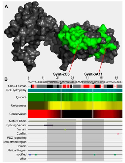 Model of syntenin-1 protein and sequence of syntenin-1 N-terminus epitopes. (A) Model of syntenin-1 protein using reference model 1N99 and Phyre2, showing spatially distinct unique epitopes of Synt-2C6 and Synt-3A11 (green). (B) Selection of unique epitopes using AbDesigner [24] that had no cross-reactivity at the six-amino acid level.