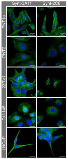 In non-malignant PNT1a and PNT2 cells and malignant 22RV1 and DU-145 cells, the Synt-3A11 monoclonal antibody produced a fibrillar staining pattern, which was consistent with a distribution on either actin filaments or microtubules (Figure 2 and Figure S3). This fibrillar staining pattern was less evident in LNCaP cells, which may relate to the elongated morphology of these cells (Figure 2). In contrast, the Synt-2C6 monoclonal antibody produced a punctate vesicular staining pattern in all the non-malignant and malignant cells tested, which was consistent with an interaction with intracellular compartments (Figure 2).