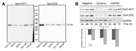 Both the Synt-3A11 and Synt-2C6 monoclonal antibodies interacted specifically with a 32 kDa molecular species of Syntenin-1. (A) Ten micrograms of total cell protein from whole-cell lysates of non-malignant PNT1a and PNT2, and 22RV1, DU-145 and LNCaP cancer cell lines were analysed by Western blotting using Synt-3A11 or Synt-2C6 (1 μg/mL) antibodies. Full-length blots are shown. (B) siRNA (non-specific control, SDCBP or GAPDH) was transfected into PNT2 cells for 24, 48 or 72 h and Western blotting performed on 10 μg total protein from whole cell lysate. Detection was performed using 1:10,000 anti-mouse HRP, Novex® ECL chemiluminescent substrate and ImageQuant™ LAS 4000 imager. Detection using Synt-3A11, Synt-2C6 were performed using separate SDS-PAGE gels. Uncropped Western blots are contained within Supplementary Materials.