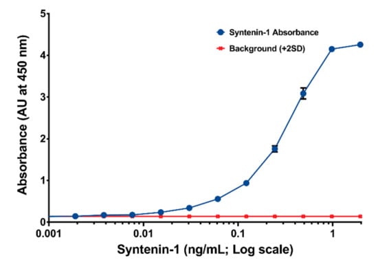 A sandwich ELISA detected purified syntenin-1 protein to ≤4 pg/mL (0.4 pg/well).