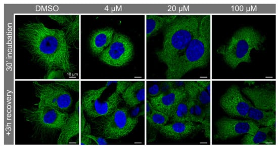 PNT2 cells were treated with Nocodazole (4, 20 and 100 μM) for 30 min before recovery using untreated media for 3 h. Microtubule disruption and re-polymerisation were observed by immunofluorescence using Synt-3A11 (1 μg/mL).