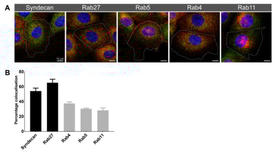 Primary antibodies used for immunofluorescence included: β-tubulin (1:50; #2146 Cell Signaling Technology, Inc., Danvers, MA, USA), Rab5 (1 μg/mL; Abcam Pty. Ltd., Cambridge, UK, #ab18211), Syndecan-1 (1:200; Santa Cruz Biotechnology Inc., Dallas, TX, USA, #sc5632), Rab27 (1:100; Abcam #ab223044), Rab4 (1:500; Abcam ab109009), Rab11 (1 μg/mL; Abcam ab180778).