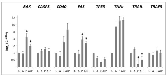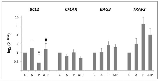 In CC, all anti-apoptotic genes were expressed, with the exception of BIRC5 (Figure 3). Expression of BCL2 gene was significantly modified by the different treatments: its expression was reduced in P group (p = 0.0256) and increased in A+P group (p = 0.0087). On the other hand, BAG3 and TRAF2 expression was increased in P group and slightly diminished in A+P group, without reaching statistical significance. Expression of CFLAR was not modified by any treatment.