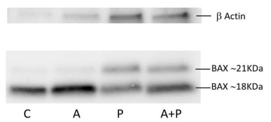 The expression of TP53 was not modified by any treatment. Expression levels of BAX, CASP3, FAS, and TRAF3 were increased in P group as compared to C group and they were diminished after GnRHa treatment. Such a behavior was particularly evident for BAX and FAS genes, that, compared to A group, were significantly up-regulated both in P (p = 0.0152 and p = 0.0006, respectively) and in A+P group (p = 0.0015 and p = 0.0006, respectively). A trend of decreasing expression of BAX and FAS was observed in A+P group than in the P one. Western Blotting analysis of BAX showed the presence of BAX~21KDa (putatively BAXα, the most common form of BAX []) and BAX~18KDa that could be the BAX cleaved product (Figure 2).