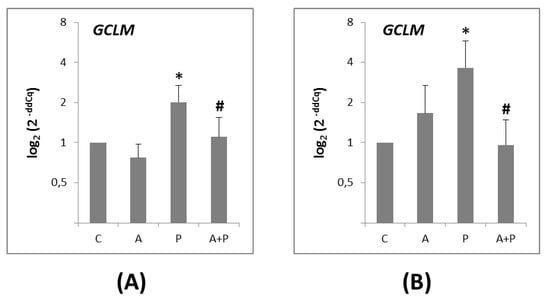 The GCLM gene was expressed in both the CC (Figure 4A) and the oocytes (Figure 4B). Its expression was significantly higher in the P group, as compared to the A group in CC and oocytes (p = 0.0191 and p = 0.0421, respectively). In the A+P group, a significant reduction of GCLM level was observed in both CC (p = 0.0191) and oocytes (p = 0.0171) compared to the P group.