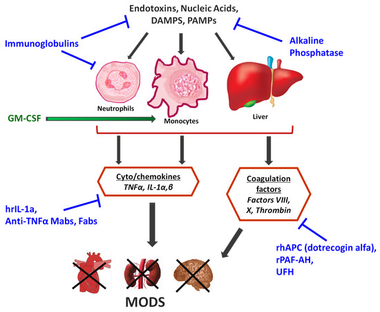 - Fisher, C.J., Jr.; Dhainaut, J.F.; Opal, S.M.; Pribble, J.P.; Balk, R.A.; Slotman, G.J.; Iberti, T.J.; Rackow, E.C.; Shapiro, M.J.; Greenman, R.L.; et al. Recombinant human interleukin 1 receptor antagonist in the treatment of patients with sepsis syndrome. Results from a randomized, double-blind, placebo-controlled trial. Phase III rhIL-1ra Sepsis Syndrome Study Group. JAMA 1994, 271, 1836–1843. [Google Scholar] [CrossRef]