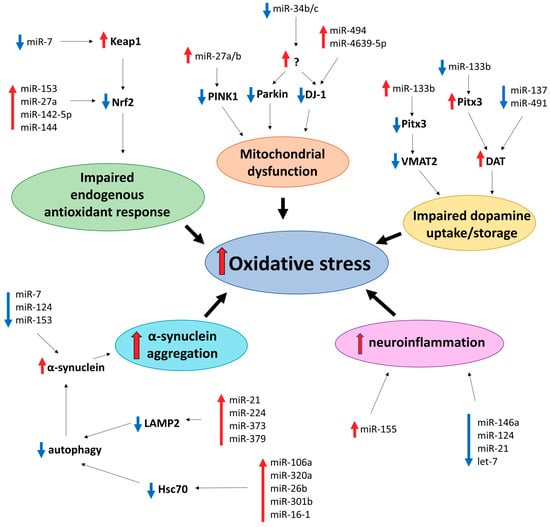 Histopathologically, PD is characterized by formation of inclusions in neuronal soma (Lewy bodies) or processes (Lewy neurites) with the protein α-synuclein as a major component []. Mutations in encoding α-synuclein gene, SNCA, and its duplication and triplication were reported to cause familial cases of PD []. α-synuclein is capable of inducing oxidative stress and increased levels of ROS, although the exact mechanism is still unclear [,,,,]. Multiple microRNAs were reported to control α-synuclein expression, including miR-7, miR-214, miR-153, and miR-34b/c, and their downregulation may contribute to α-synuclein-mediated neurotoxicity in PD [,,,]. α-synuclein aggregation can also be mediated through its impaired removal by chaperon-mediated autophagy. For example, miR-21, miR-224, miR-373, and miR-379 were demonstrated to downregulate LAMP2 expression, and miR-26b, miR-106a, miR-301b, miR-320a, and miR-16-1 were shown to suppress expression of Hsc70 [,,]. Upregulation of some of these microRNAs were detected in PD patients []. MicroRNA regulation of α-synuclein expression has recently been systematically reviewed elsewhere []. Altogether, the literature describes multiple mechanisms for microRNAs to contribute to α-synuclein accumulation, which consequently could lead to oxidative stress.