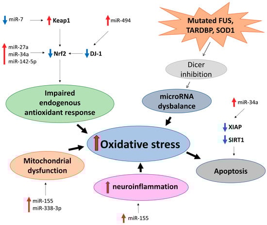 A number of differentially expressed miRNAs in ALS patients versus controls regulate genes involved in oxidative stress, e.g., reducing or counteracting ROS/reactive nitrogen species and may be useful as biomarkers and/or therapeutics. For example, miR-27a, miR-34a, miR-155, miR-142-5p, and miR-338-3p have been studied as biomarkers and potential therapeutic targets in relation to ALS and are involved in oxidative stress directly or indirectly [,,,] (Figure 3).