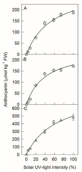 Concentrations of anthocyanin in ‘Fuji’ apple peel in 2016 (A) and 2017 (B) and ‘Red Delicious’ apple peel in 2017 (C) after exposing bagged fruits to diverse sunlight intensities. Each data point represents mean ± SE (n = 5). The fitting formula were y = , R2 = 0.988 (A), y = , R2 = 0.979 (B), and y = , R2 = 0.992 (C), respectively.