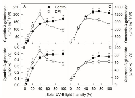 The concentrations of flavonol, quercetin-3-galactoside, and quercetin-3-glucoside changed in similar patterns to cyanidin-3-glycoside in ‘Fuji’ apple peel as the solar UV-B light intensity increased (Figure 2C,D). When the light intensity was below 50%, DPI treatment increased the concentration of cyanidin-3-glycoside, but did not change the concentration of quercetin-3-glycoside in ‘Fuji’ apple peel. When the solar light intensity was over 50%, DPI treatment decreased the concentrations of both cyanidin-3-glycoside and quercetin-3-glycoside.
